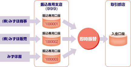 「ベストレシーバー」では、各々の請求先に対して、別々の振込指定口座を割り当てることで、振込依頼人(=請求先)の特定がほぼ100%可能となります。振込依頼人から振り込まれた資金は、即時にご指定の口座に振り替えます。