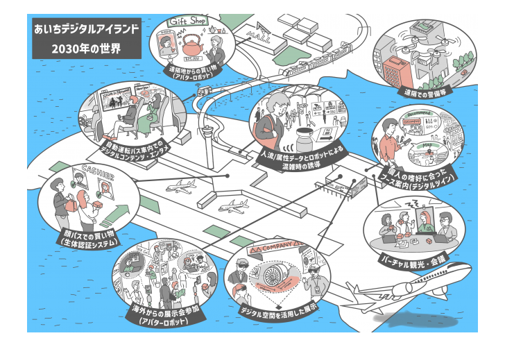 愛知県は、中部国際空港島および周辺地域を、先端デジタル技術を活用した革新的事業・サービスのオープンイノベーションフィールドとして位置付け、2030年に導入が見込まれる近未来の事業・サービスの、早期社会実装を目指す「あいちデジタルアイランドプロジェクト」を2022年度から推進しています。