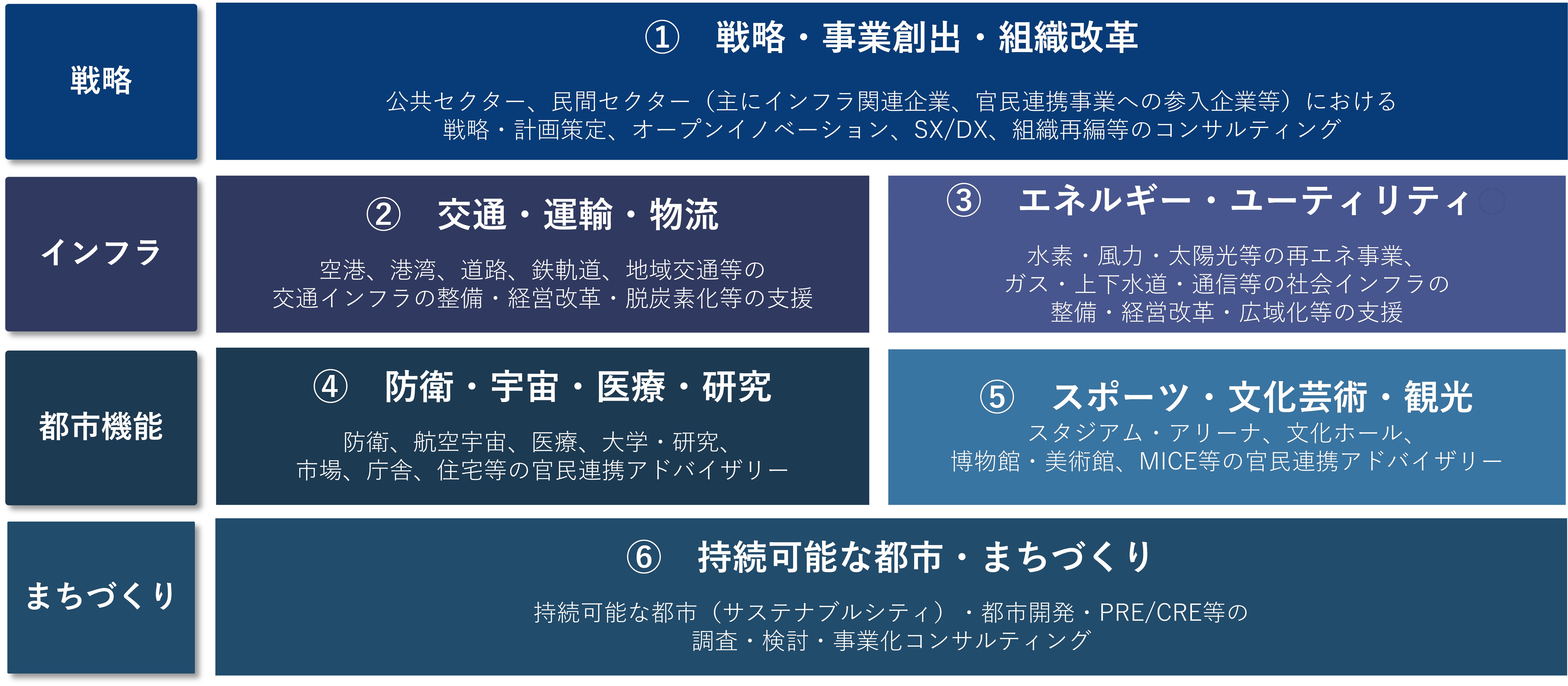 主な注力領域としては、①戦略・事業創出・組織改革、②交通・運輸・物流、③エネルギー・ユーティリティ、④防衛・宇宙・医療・研究、⑤スポーツ・文化芸術・観光、⑥持続可能な都市・まちづくりの6つの領域・分野としており、官民連携をテーマに国家的プロジェクトから地域活性化プロジェクトまで幅広く取り組んでいます。