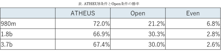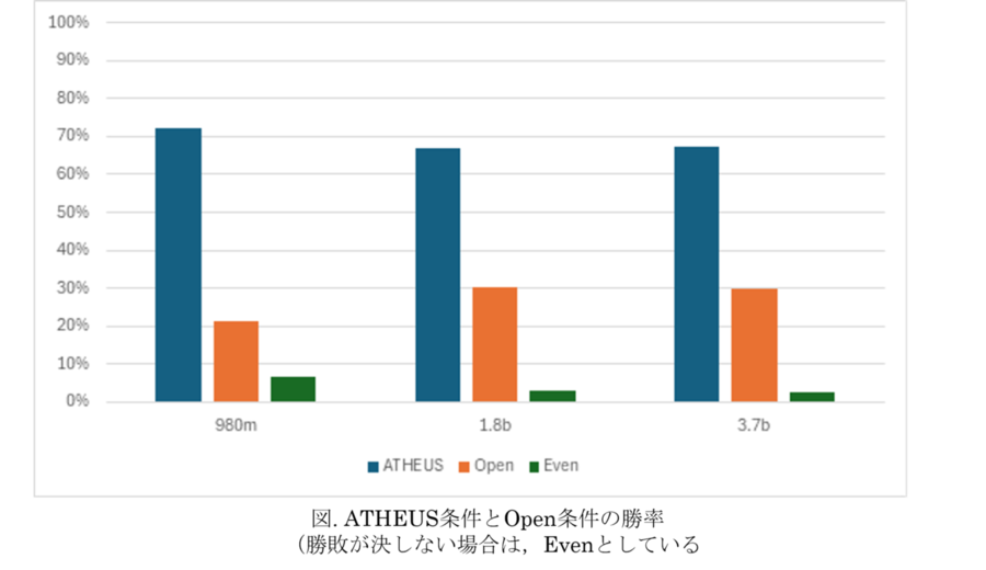 性能評価においては,ELYZA-tasks-100[8]に含まれるインストラクションを,Openデータ条件およびATHEUSデータ条件で生成されたモデルに与え,その出力の比較を生成AIサービス(gpt-4o-mini)によって自動的に行いました。いわゆる,LLM-as-a-Judgeを用いた相対評価によって,勝者となるデータ条件の判定を行いました。