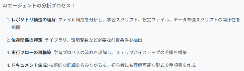 MCP(ファイルの作成・編集が可能なMCP)を組み合わせることで、ドキュメントのたたき台を自動生成することができます。たとえば、「リポジトリ○○でモデルを学習する手順を調査し、手順書.mdとして格納してください」といった指示に対して、以下のような動作フローを実現できました。