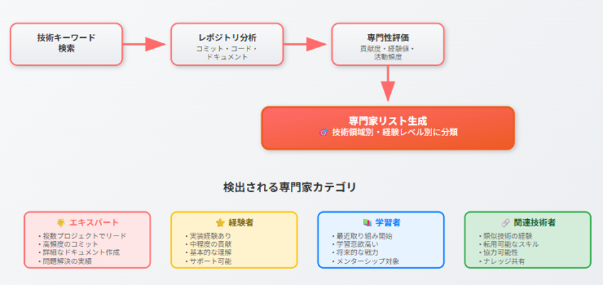 このアプローチを活用することで、長期にわたり開発が続いているプロジェクトにおいて、READMEと実態との乖離を是正することが可能です。READMEの自動的な更新により、プロジェクトの理解を促進し、新規メンバーのオンボーディング効率の向上も期待できます。さらに、GitBucketリポジトリを分析させることで、各分野の技術エキスパートを可視化する、いわゆる「ナレッジマッピング」を自動生成することも可能となるでしょう。