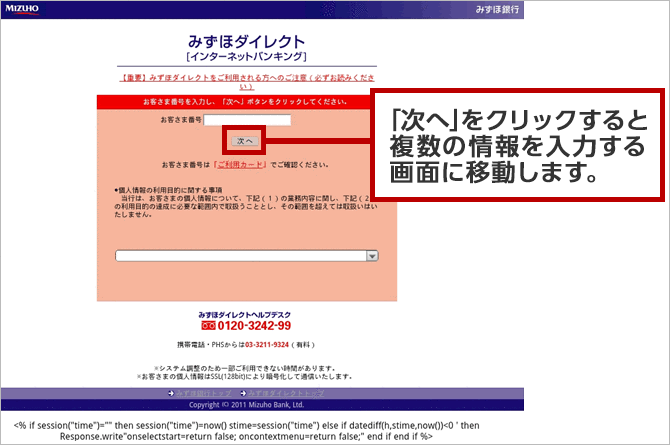 万一、お客さま情報を入力してしまった場合、以下お問い合わせ専用ダイヤルまで直ちにご連絡ください。