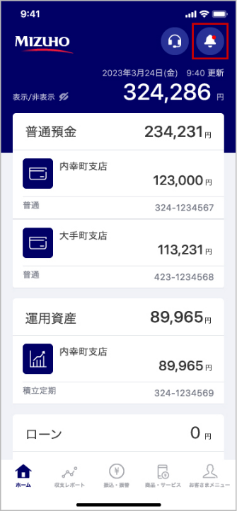 - *お知らせはみずほダイレクトアプリのホーム右上のベルマークをタップしてご確認いただけます。