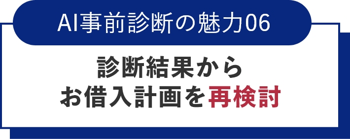 - *AI事前診断はお客さまがご入力いただいた内容に基づき、ご希望のお借入金額の審査が下りる可能性を診断するサービスであり、ご融資をお約束するものではありません。お借り入れには、AI事前診断後に正式審査のお申し込みが必要となります。