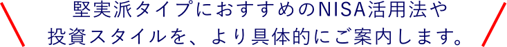 そんな堅実派タイプにおすすめのNISA活用法は、気付いたら貯蓄ができている!少額からコツコツ始められる積立投資信託です!毎日状況の確認をしなくても、長期・積立・分散投資のスタンスで安心して運用できます。