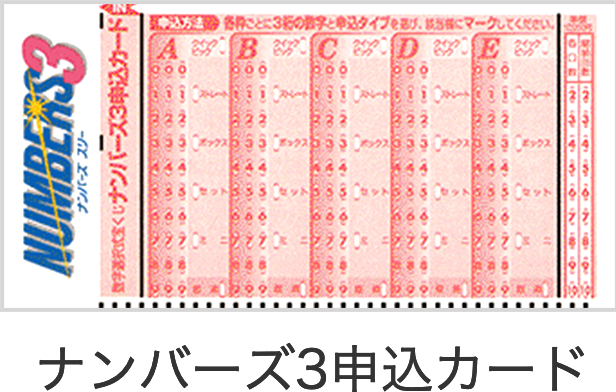 ナンバーズは、1枚のカードで最高5通りの申込、最高10口までの「まとめ買い」、最高10回先の抽せん分までの「継続買い」もできます。上記の「申込カード」の他、購入日より10回先までの抽せん日のうち、ご希望の抽せん日を指定できる「チャレンジカード」もあります。記念日のプレゼントやパーティーのアトラクションなどにどうぞ。